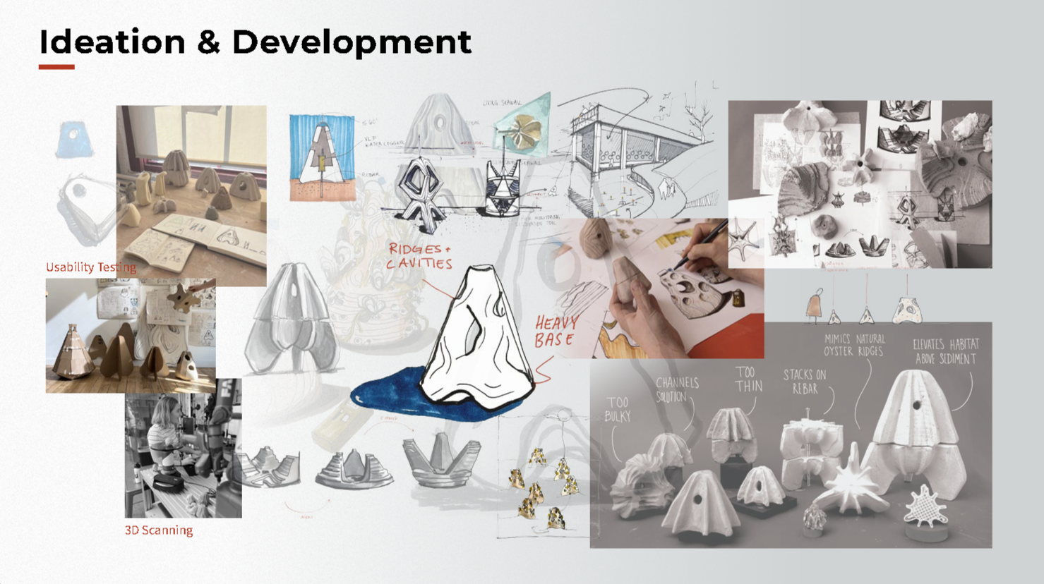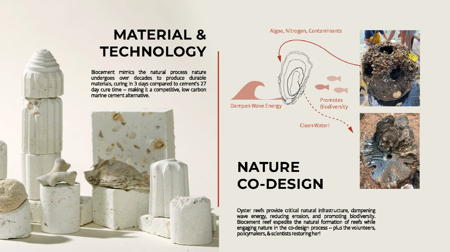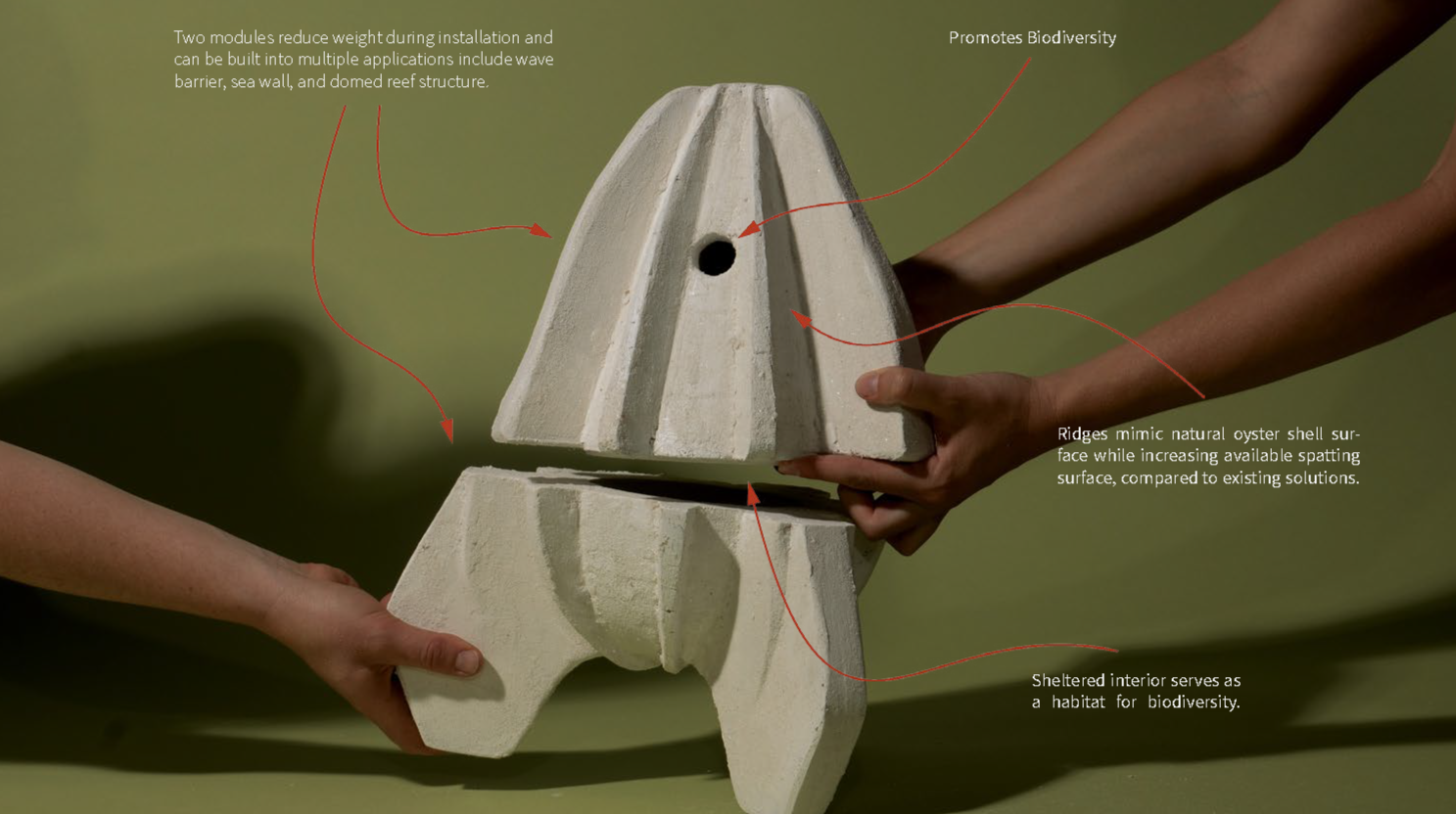 Reef Rocket is a bio-cement reef structure grown by plant enzymes. Biomineralization is a natural phenomena used by nature to construct resilient material, like that produced by oysters to grow their shells and reefs. By facilitating and expediting this process, Reef Rocket anticipates the need to decarbonize cement production by employing nature in the manufacturing process while engaging communities most impacted by rising sea levels in fabricating and restoring natural reefs that reduce coastal flooding, promote biodiversity, and filter water.